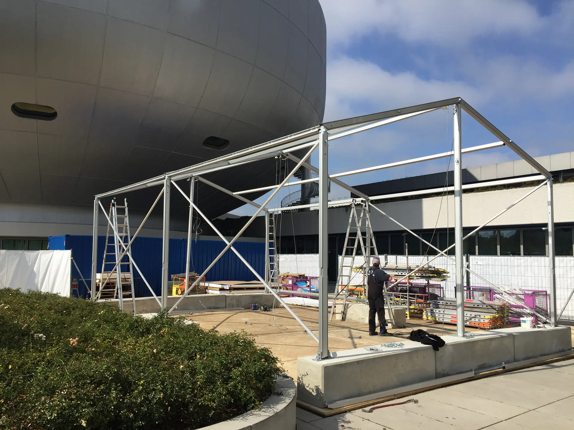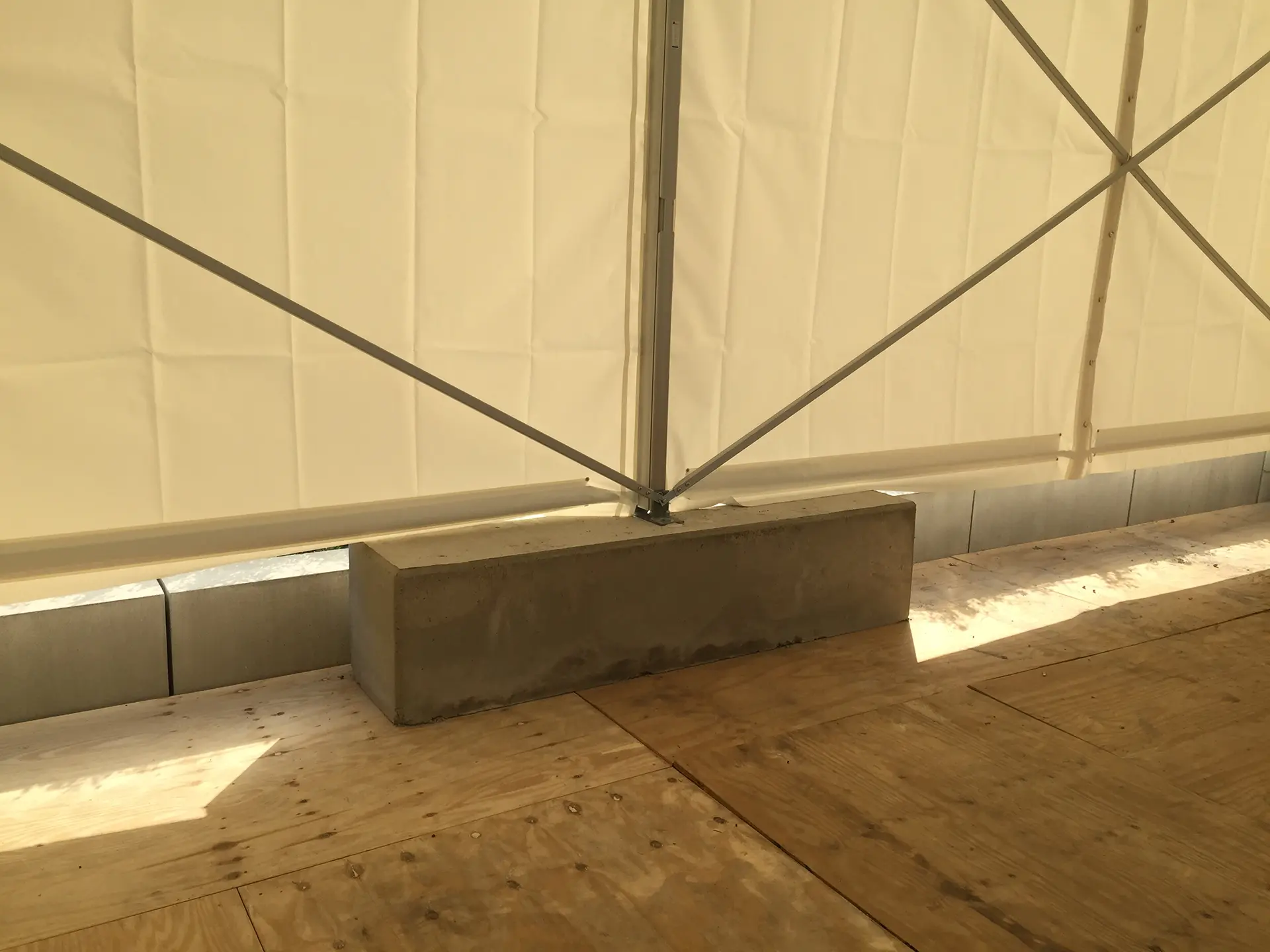 Wenn eine Erdverankerung auf Pflaster oder Asphalt mit Heringen oder Nägeln nicht möglich ist, haben wir die Möglichkeit, das Zelt mit zusätzlichen Gewichten zu sichern. Verwendet werden dafür Betongewichte, Wassergewichte in Tanks oder spezielle Ballastierungseinheiten, die an den Fußstützen angebracht werden, um Stabilität gegen Wind und Belastung zu gewährleisten. Die Gewichtsmenge hängt von der Zeltgröße ab. Um die Optik zu wahren, kann die Ballastierung auf Wunsch verkleidet werden.